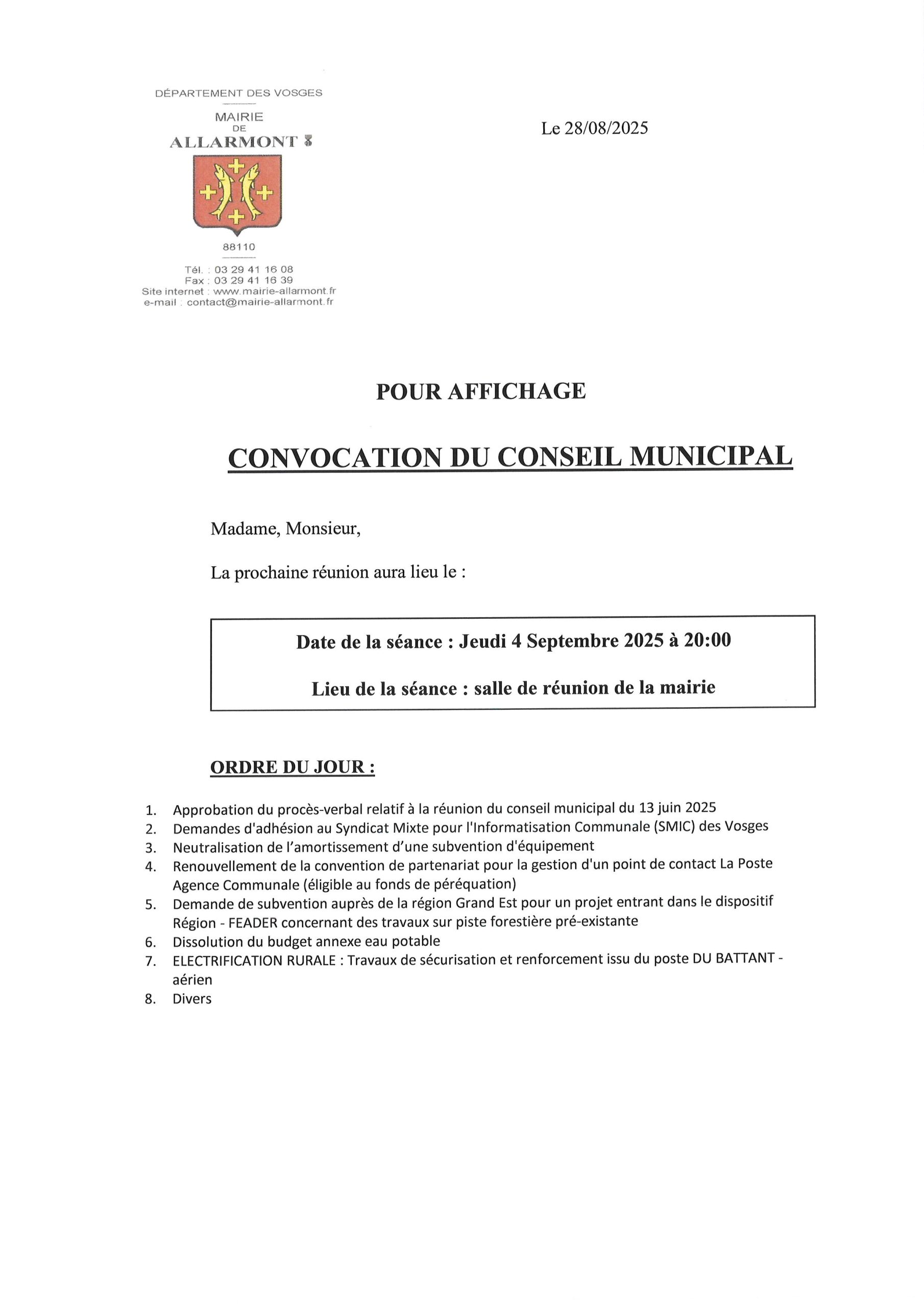 CONVOCATION DU CONSEIL MUNICIPAL DU 4 SEPTEMBRE 2025