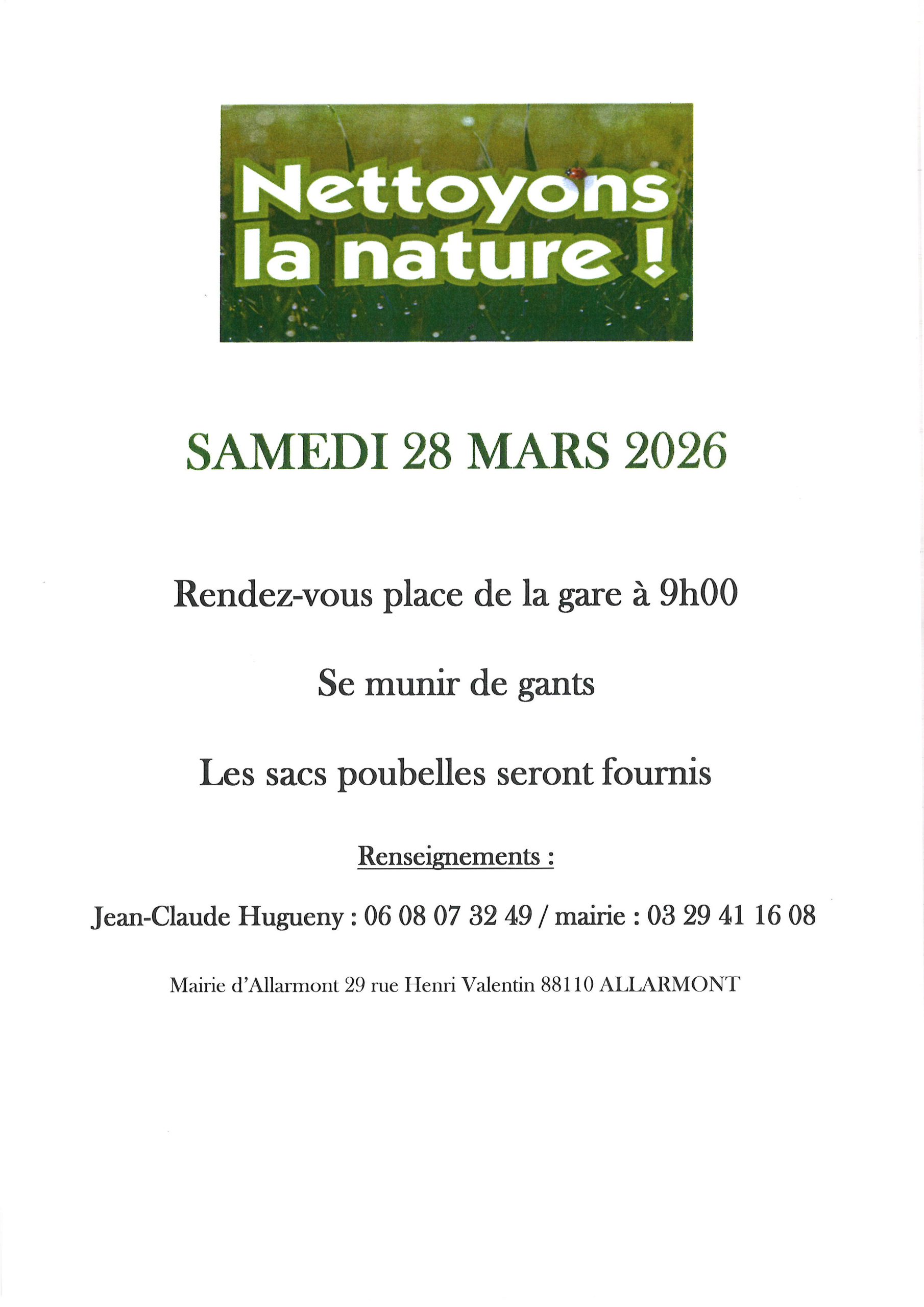 NETTOYONS LA NATURE LE SAMEDI 28 MARS 2026 – RENDEZ-VOUS PLACE DE LA GARE A 9H