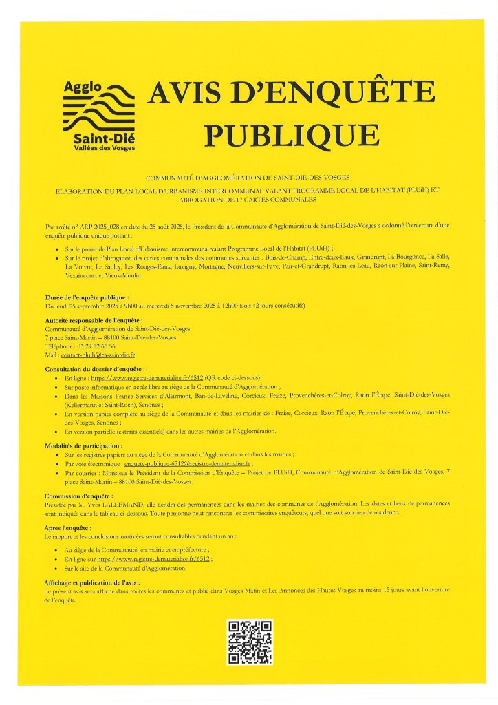 AVIS D’ENQUÊTE PUBLIQUE MERCREDI 8 OCTOBRE 2025 DE 9H A 11H A LA MAIRIE